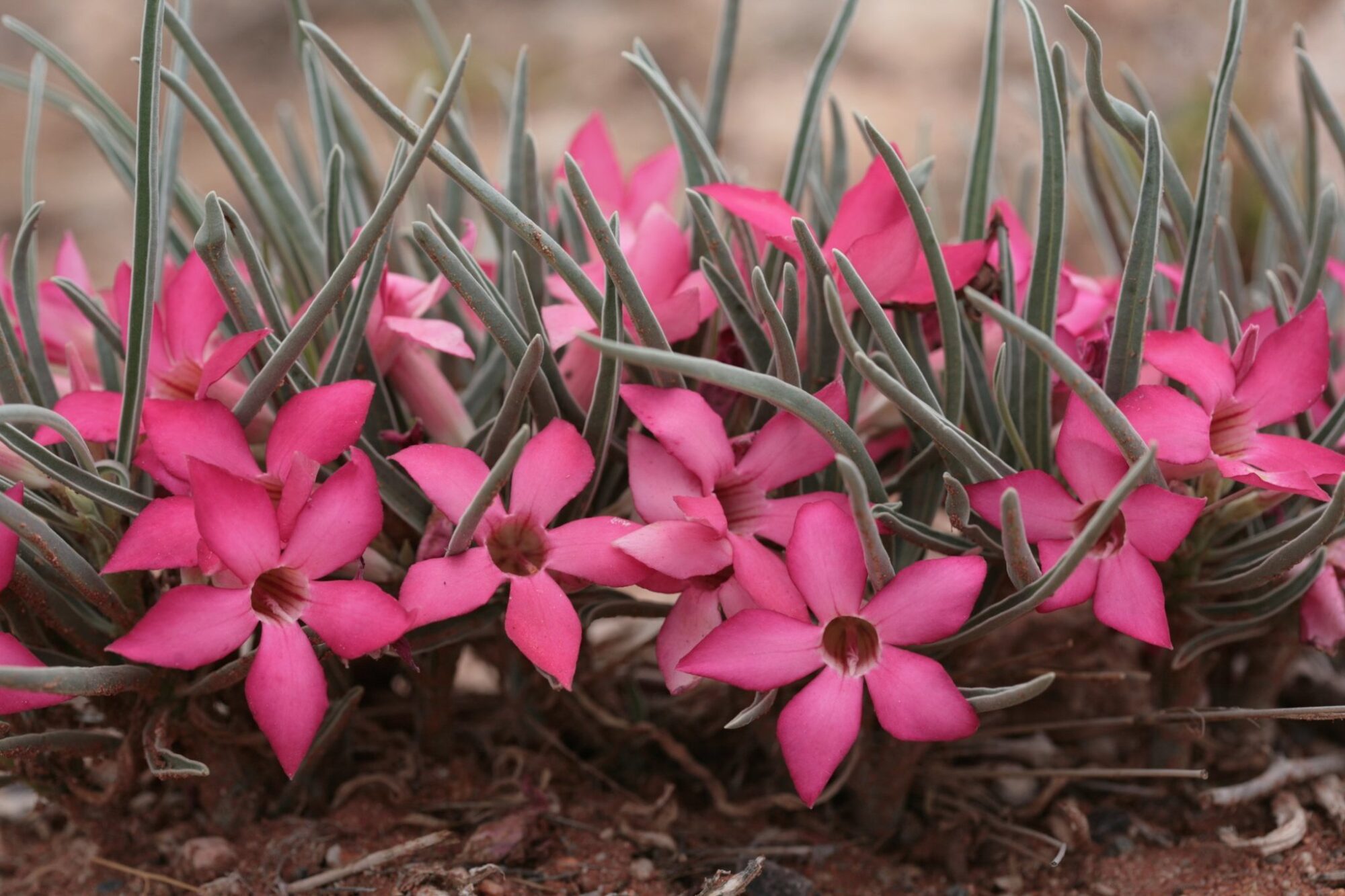 - Adenium obesum (Wüstenrose): Die Wüstenrose ist für ihre auffälligen, trompetenförmigen Blüten und ihren verdickten Stamm bekannt, der Wasser speichert. Sie ist eine beliebte Zierpflanze in warmen Klimazonen und als Topfpflanze.